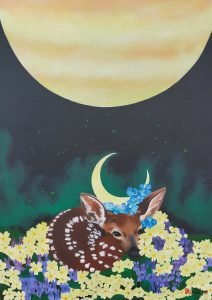 I suoi lavori evidenziano una profonda connessione con un sapere ancestrale. La sua visione piena di colore, gioia, stelle e libertà asseconda quel fluire morbido e misterioso della vita.
